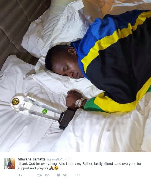 Samatta baadaye aliweka kwenye Twitter picha hii inayomuonyesha akiwa na tuzo yake na akiwa amejifunika kwa shiti yenye rangi za bendera ya Tanzania.