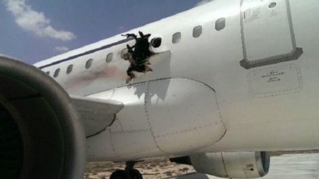 Mlipuko huo ulisababisha shimo kubwa katika ubavu wa ndege hiyo karibu na hifadhi ya mafuta upande wa kulia uliomlazimu rubani wa ndege hiyo aina ya Airbus 321 iliyokuwa ikielekea Djibouti kuirejesha katika uwanja wa ndege wa Mogadishu Somalia.