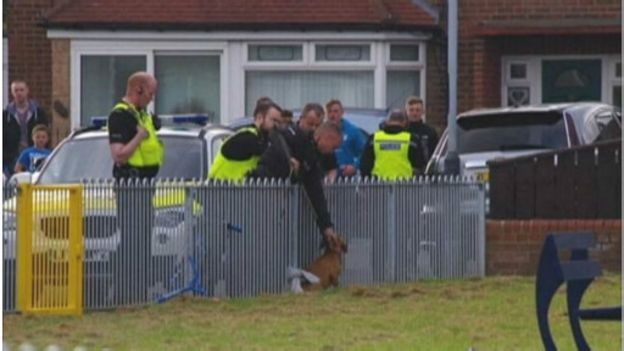 Baba ya mmoja wa watoto waliojeruhiwa alifanikiwa kumfunga mbwa huyo katika uwa,kabla ya maafisa wa polisi kuwasili ili kumpeleka katika kibanda chake.