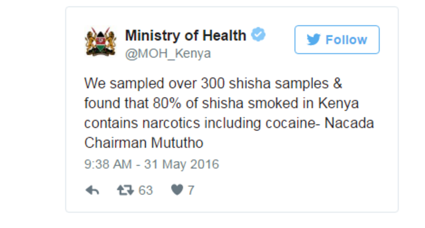 Katika chapisho lao la Twitter , wizara hiyo imesema imepata chembechembe za dawa aina ya cocaine na dawa nyengine katika sampuli 4 kati ya 5 zilizotolewa kwa bidhaa za tumbaku ambazo hutumiwa na watu ambao hutumia viko kuvuta tumbaku.