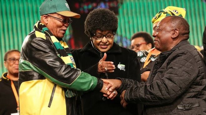 Winnie Madikizela Mandela aliwalazimisha viongozi wawili maaruf nchini humo rais Jacob Zuma na makamu wa rais Cyril Ramaphosa kusalimiana.