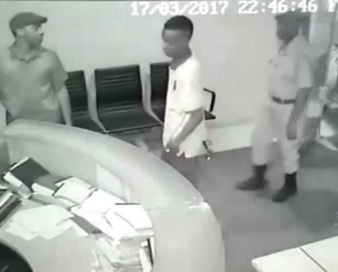 Kamera za CCTV katika kituo hicho zinamuonesha mtu anayedaiwa kuwa kamishna wa jiji la Dar es Salaam Paul Makonda (mwenye kofia), akiwa anasindikizwa na polisi waliojihami, akiingia studio za Clouds Media Group.