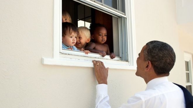 Picha hiyo inaonyesha ziara ya bwana Obama 2011 katika kituo cha kuangalia watoto katika eneo la Bethesda, mjini Maryland.